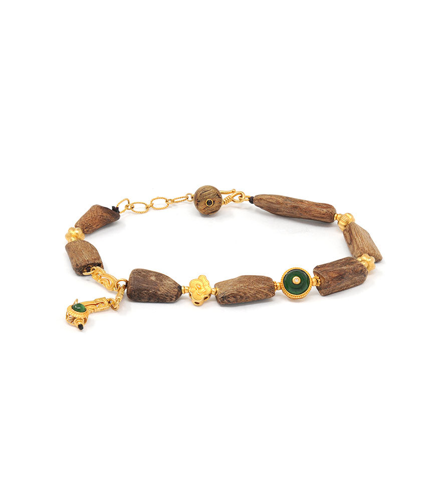 Agarwood Bracelet with Jade Coins & Gold Filigree Charms