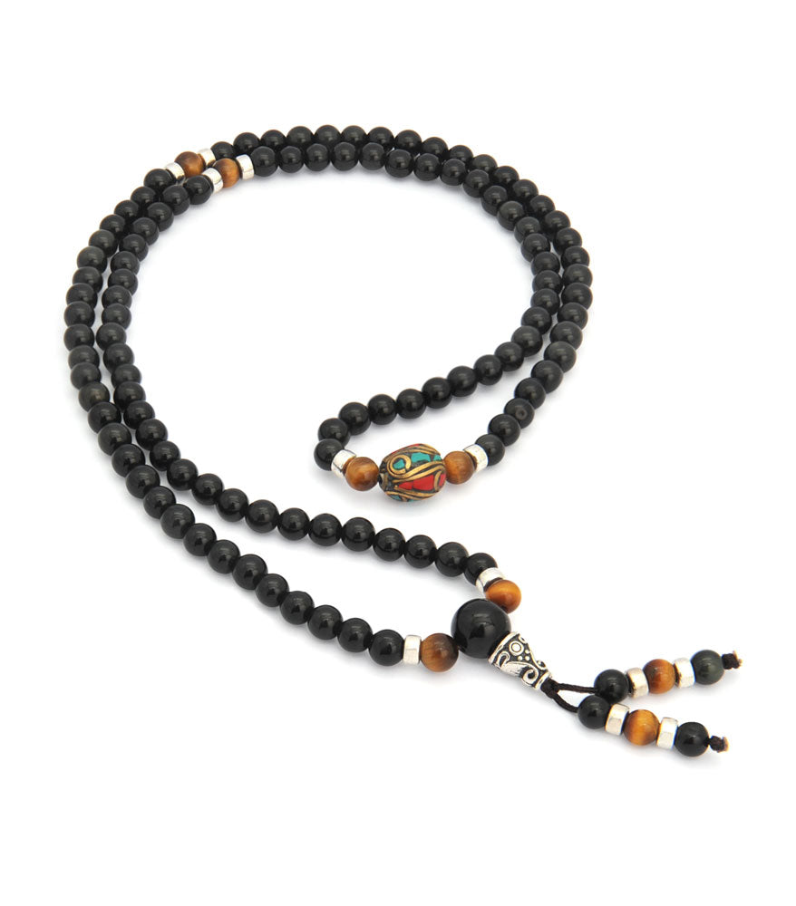 Care instructions: This exquisite mala from our Designer Mala Collection contains rainbow black obsidian, OMANI amber beads and a silver Double Dorje ornament. Wipe with a damp cloth periodically to maintain the cleanliness of your mala. Mala beads are sacred items; please store them in pouch when not in use. You may also perform periodic energy cleansing by using a metal/crystal singing bowl or, by dipping your mala beads in the sun-water and drying them quickly.