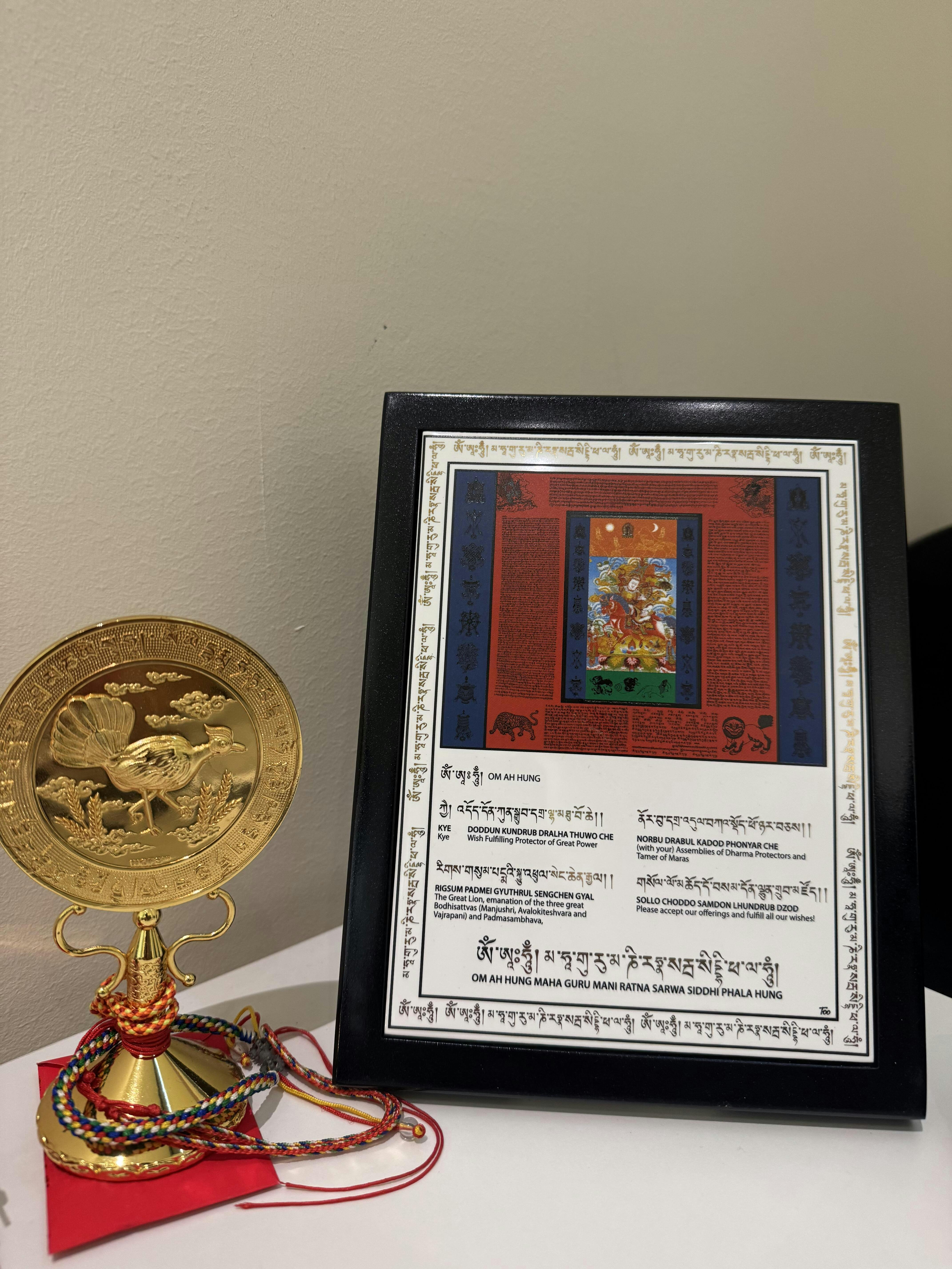 King Gesar ruled the kingdom of Ling in eastern Tibet around eight centuries ago. He was believed to be one of the manifestations of Guru Rinpoche. Displaying Gesar of Ling plaque in your house will bring swift success and fame & recognition. He also bring victory in all activities and protect you from any harm. Place this plaque high up in your house to increase your inner essence (lung ta) as well.