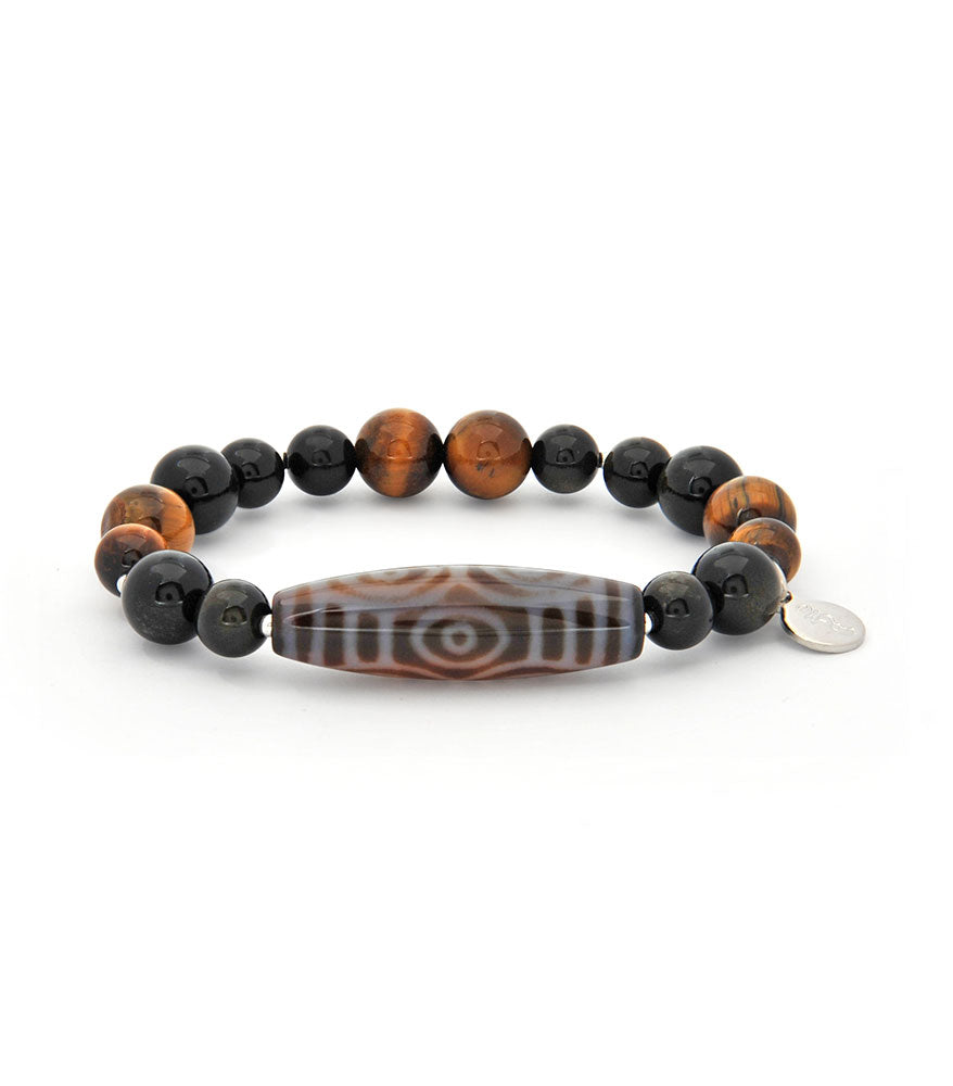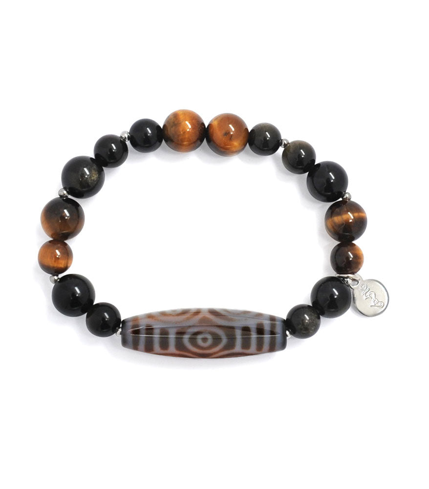 Care instructions: This dzi bracelet contains: tiger eye beads, rainbow obsidian beads and Dzi Beads. To clean, use a damp cloth but do not soak in water. Silver elements may tarnish when exposed to sweat for prolonged periods; polish with a jewellery cleaning cloth to maintain a quality shine.