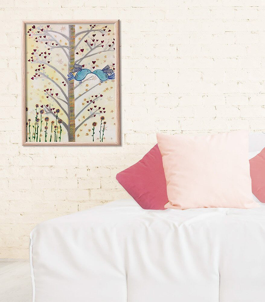 Displaying this print will symbolically encourage love into your life. Two birds kissing together in this love heart tree will bring auspicious energy. Hang this print in the South-west of your bedroom or of the house for attracting and experiencing an equal loving relationship.