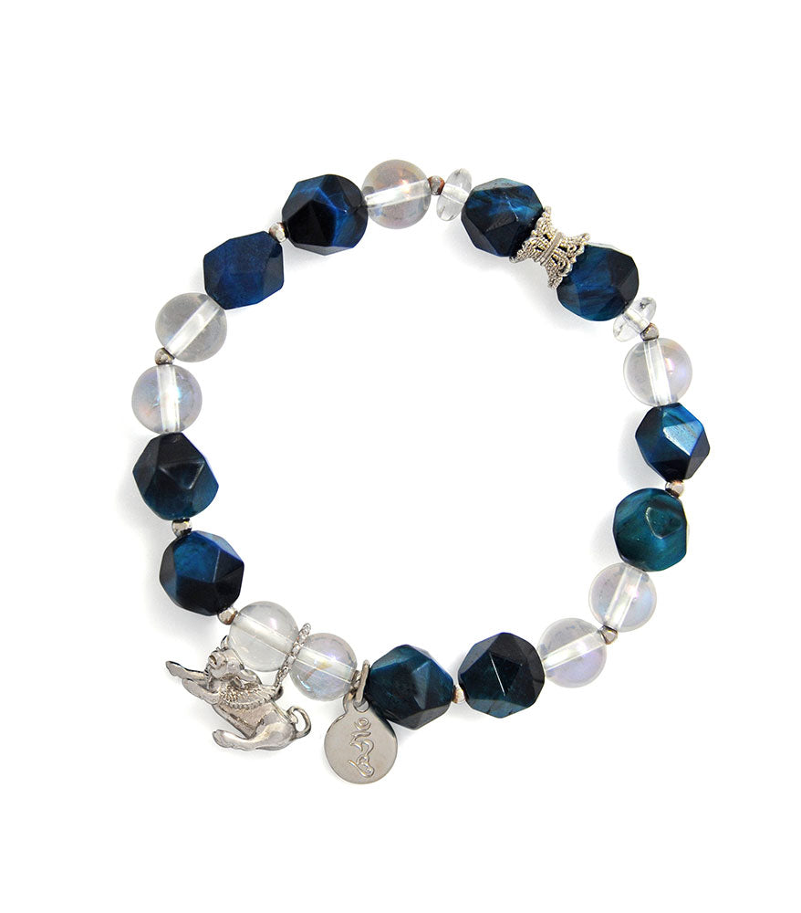 This bracelet features striking blue tiger eye star-cut faceted beads paired with sparkling clear crystal glass beads, its shades of blue calling in the vital Water element energy of the year. Beautiful worn alone or stacked with other Sky Animal bracelets, it is both a potent wealth talisman and a timeless accessory.