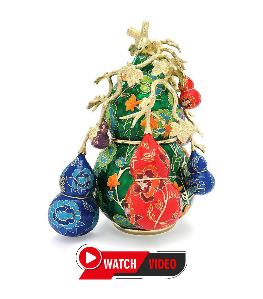This magnificent cluster of 9 Wu Lou is the ultimate symbol of good health and long life - not just for the body, but also for the mind and spirit. Each Wu Lou is painted with auspicious motifs, including golden pheasants for harmony, coins and ingots for wealth, and healing herbs and flowers for wellbeing.