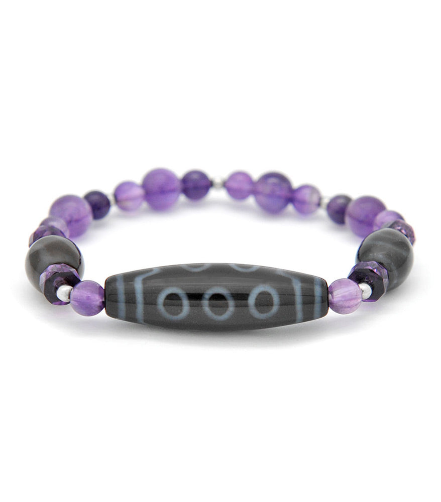 Care instructions: This charm bracelet contains: silver bead balls, amethyst beads, and a quartz Dzi Bead. To clean, use a damp cloth but do not soak in water. Silver elements may tarnish when exposed to sweat for prolonged periods; polish with a jewellery cleaning cloth to maintain a quality shine.