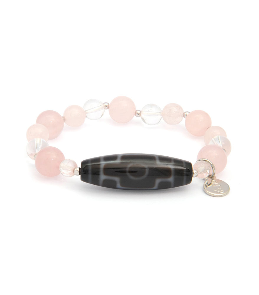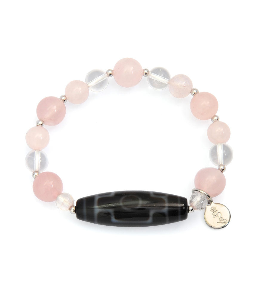 Care instructions: This charm bracelet contains: silver bead balls, quartz beads, rose quartz beads, and a quartz Dzi Bead. To clean, use a damp cloth but do not soak in water. Silver elements may tarnish when exposed to sweat for prolonged periods; polish with a jewellery cleaning cloth to maintain a quality shine.