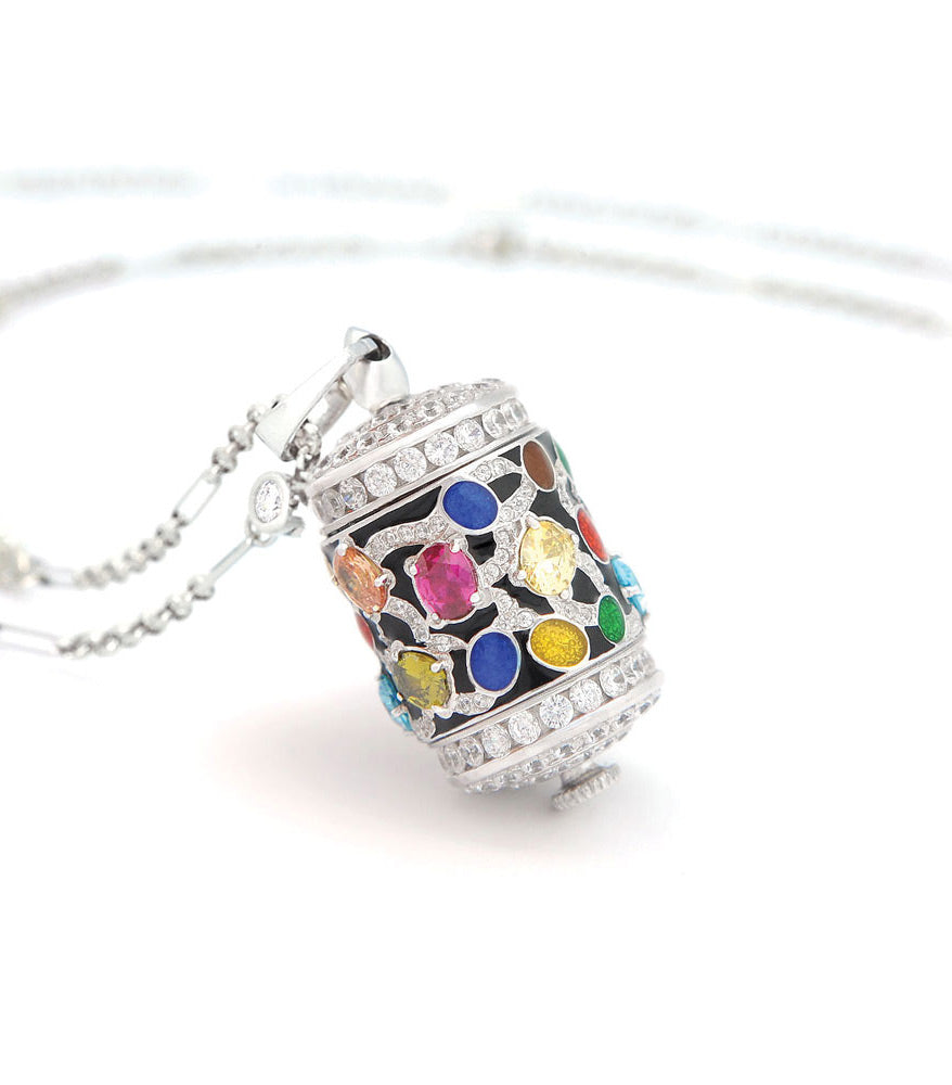 Stunningly decorated with precious stones and filled with thousands of precious mantras of the five Dzambhalas! Spin your way to effortless wealth and success! Wearing it protects against financial disaster.