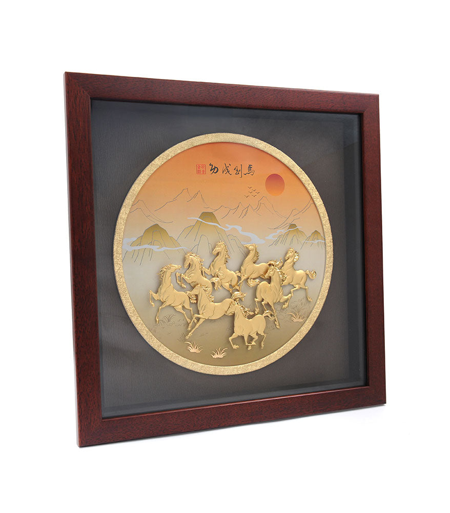 This elegant plaque features eight golden horses frolicking with joy, symbolizing the noble spirit of the Horse, revered in Chinese culture for its strength, grace and ability to bring swift success and upward mobility.