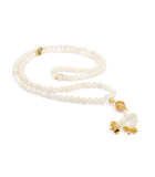 This mala consists of 108 White Agate beads, two Omani prayer wheel charms, a filigree gold-plated Dragon Ball charm and a gold-plated Dorje & Bell. White Agate restores the balance of chakras, reduces emotional stress and improves one’s mood.