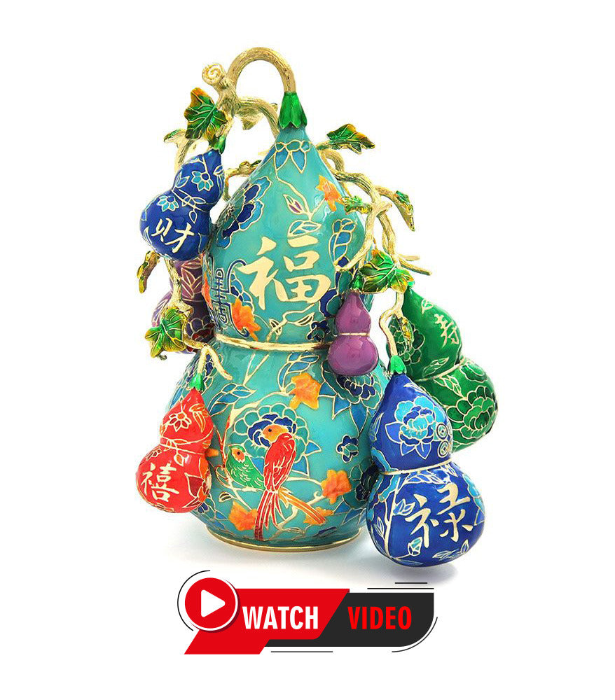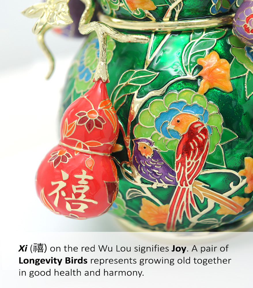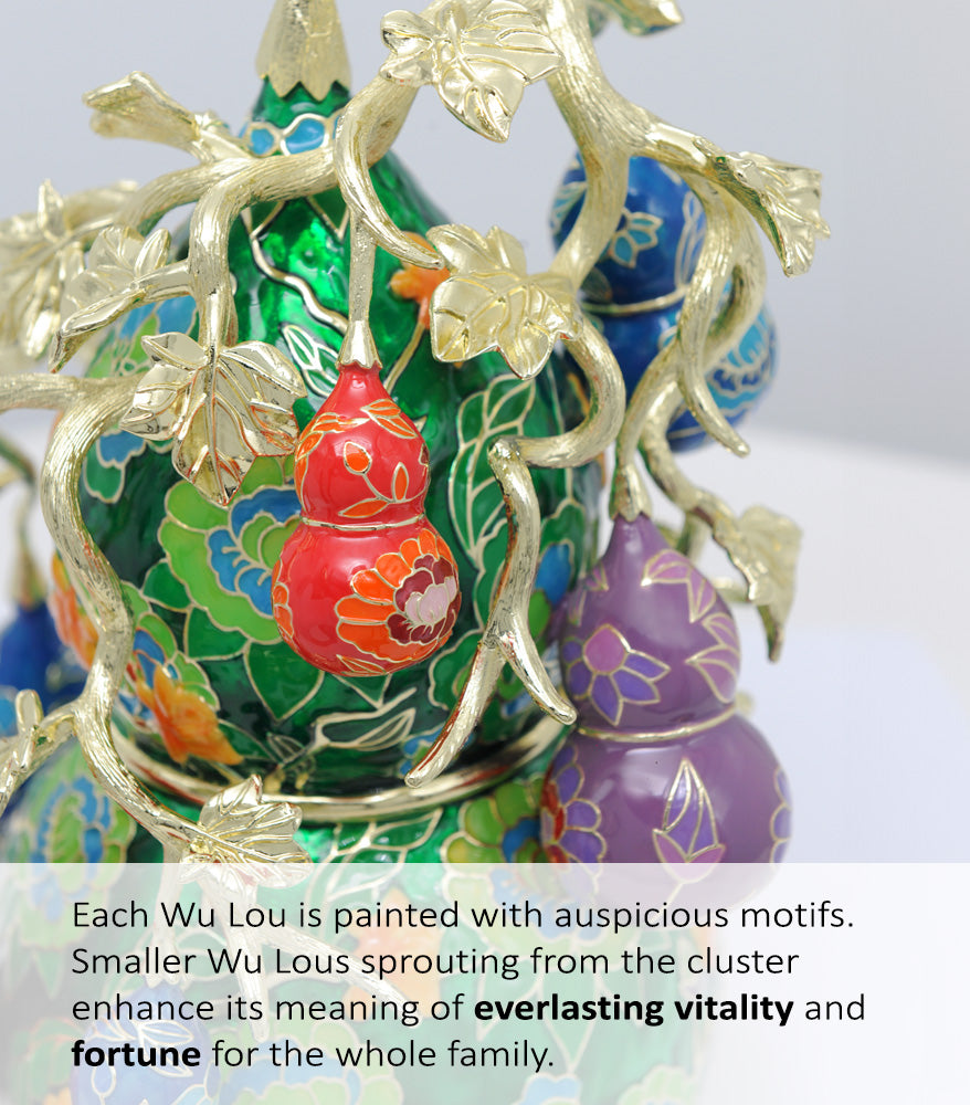 This magnificent cluster of 9 Wu Lou is the ultimate symbol of good health and long life - not just for the body, but also for the mind and spirit. Each Wu Lou is painted with auspicious motifs, including golden pheasants for harmony, coins and ingots for wealth, and healing herbs and flowers for wellbeing.