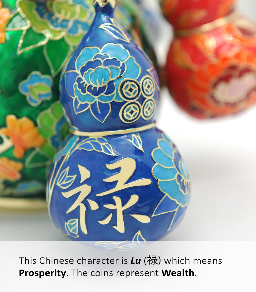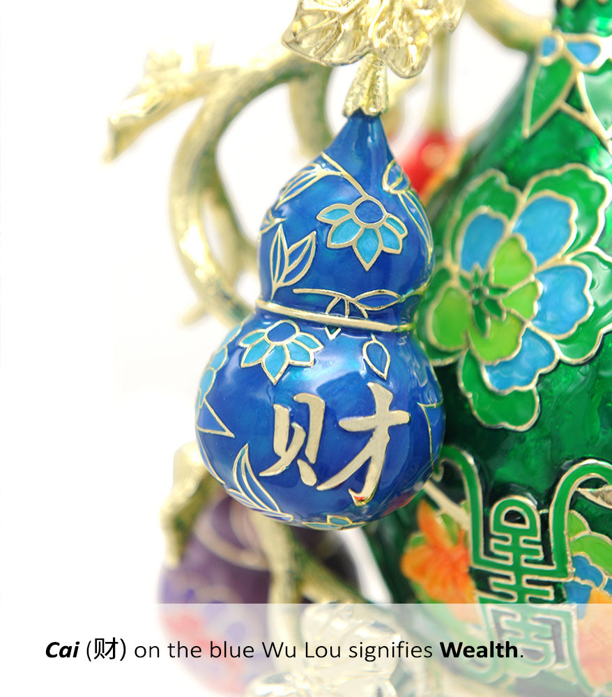 The five largest Wu Lous feature the powerful Chinese characters Fu (Blessings), Lu (Prosperity), Shou (Longevity), Xi (Joy), and Cai (Wealth). Additional smaller Wu Lous sprouting from the cluster enhance its meaning of everlasting vitality and fortune for the whole family.