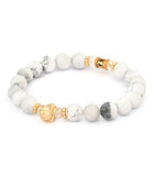 Howlite is a gemstone often worn as a remedy to help dispel negative feelings. You can use it to assist when doing meditation or to help you let go of unhealthy feelings and old emotional pains. This bracelet comes with your animal sign charm plated in 18K gold, as well as a miniature Prayer Wheel charm featuring OM MANI PADME HUM, the mantra of the Compassionate Buddha.