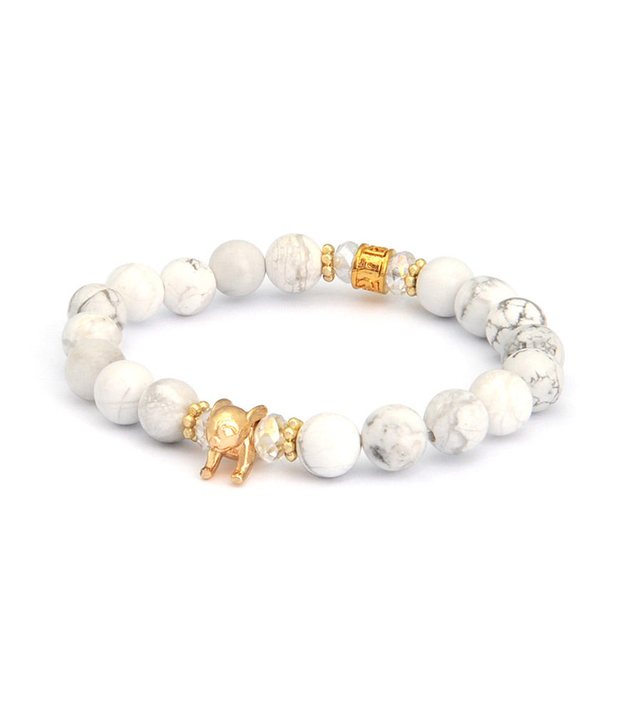 Howlite is a gemstone often worn as a remedy to help dispel negative feelings. You can use it to assist when doing meditation or to help you let go of unhealthy feelings and old emotional pains. This bracelet comes with your animal sign charm plated in 18K gold, as well as a miniature Prayer Wheel charm featuring OM MANI PADME HUM, the mantra of the Compassionate Buddha.