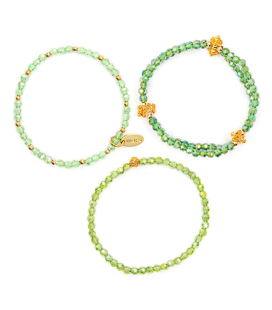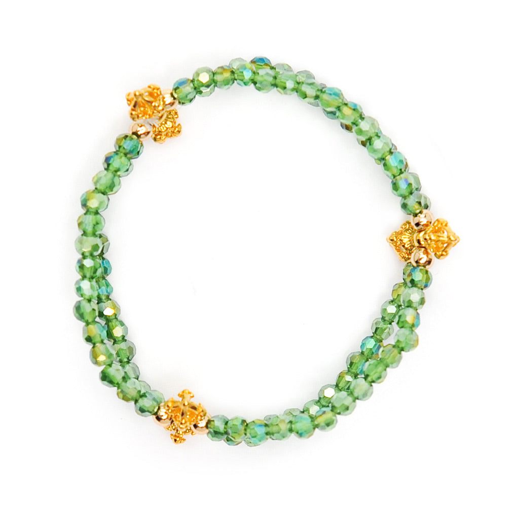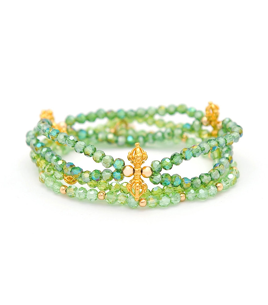 Care instructions: This bracelet is strung with jade glass beads, peridot glass beads and three chrome-gold-plated Dorje ornaments. Fastenings are made from a rhodium-plated brass alloy to reduce allergic reactions. Prolonged exposure to sweat and perfume may tarnish the finish of the charm and fastenings. Polish with a jewellery-polishing cloth periodically to maintain the shine and cleanliness of your bracelet. Keep in a sealed jewellery pouch or box when not in use.