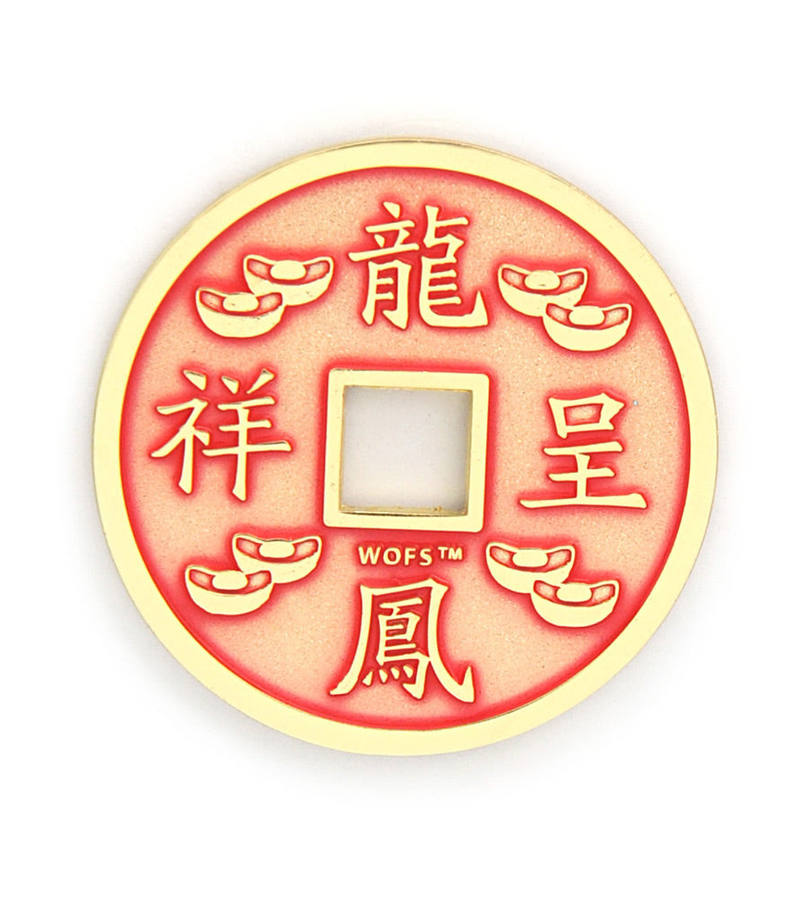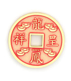 This lucky coin bears the characters 龍鳳呈祥 (Long Feng Cheng Xiang) meaning the Dragon & Phoenix brings good omens. The reverse side of this coin has the yin – yang emblem of the Dragon & Phoenix bringing auspicious meanings of a fruitful marriage blessed with a great deal of success and prosperity as well as having many male descendants.
