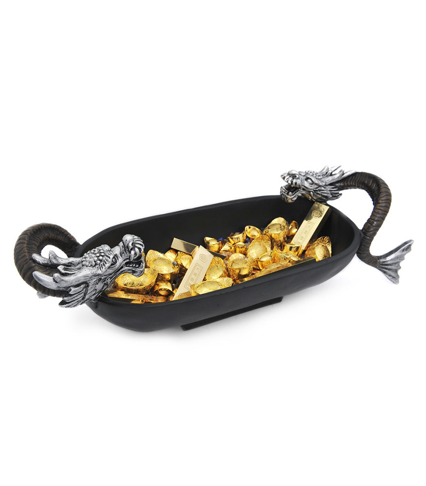 This Treasure Trove is a symbol of vast accumulation of wealth and assets. Start to symbolically amass “asset wealth” for your family by filling your Double Dragon Carp Treasure Trove with gold bars and ingots. (See options below to add ingots, gold bar and semi precious stones)