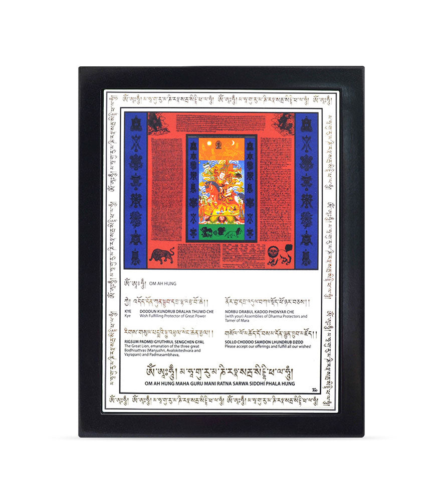 King Gesar ruled the kingdom of Ling in eastern Tibet around eight centuries ago. He was believed to be one of the manifestations of Guru Rinpoche. Displaying Gesar of Ling plaque in your house will bring swift success and fame & recognition. He also bring victory in all activities and protect you from any harm. Place this plaque high up in your house to increase your inner essence (lung ta) as well.