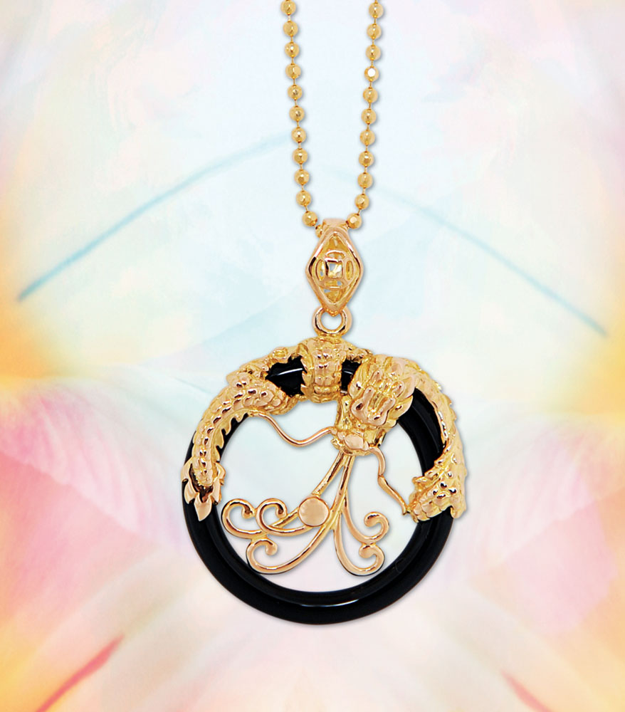 The mighty Celestial Dragon brings change and positive yang energy! Invite the transformative powers of the Dragon with this beautiful Dragon Embracing Agate pendant. Black Agate is a powerful gemstone known for its properties of attracting good fortune, deflecting bad intentions and protecting against black magic. Through the centuries, it has been used as an amulet talisman and also for calming stress and promoting healing in crystal therapy. This exquisite gold Dragon is skillfully crafted to embrace a Black Agate ring and is cast from solid 18K Gold. Those born in the years of the Rat, Monkey, Snake, Rabbit, Tiger and Rooster have a special connection with the Dragon will also enjoy additional benefits of influential allies by wearing this beautiful pendant.