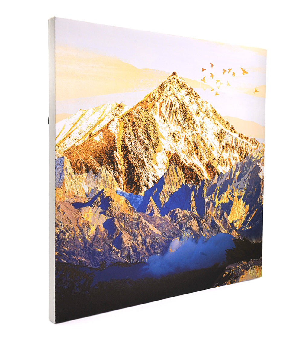 Printed on the canvas, this golden mountain provides superb and dazzling support when hung behind one's desk. A solid golden mountain behind you gives you support from your boss and your colleagues, protection against office politics and helps get your work and effort recognized. The flock of birds reaching the top of the mountain bring good news and recognition for your talents.