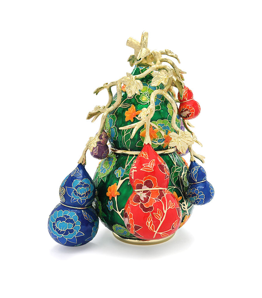 This magnificent cluster of 9 Wu Lou is the ultimate symbol of good health and long life - not just for the body, but also for the mind and spirit. Each Wu Lou is painted with auspicious motifs, including golden pheasants for harmony, coins and ingots for wealth, and healing herbs and flowers for wellbeing.