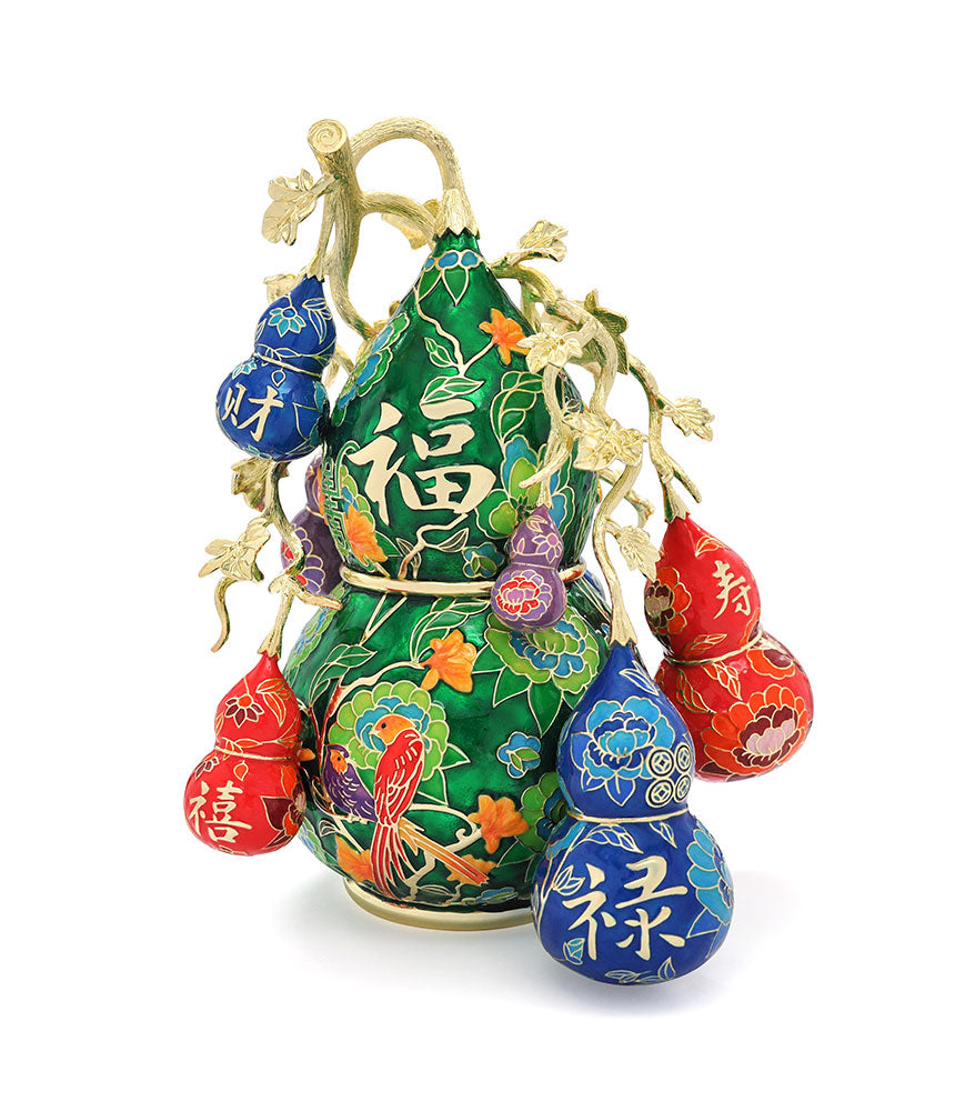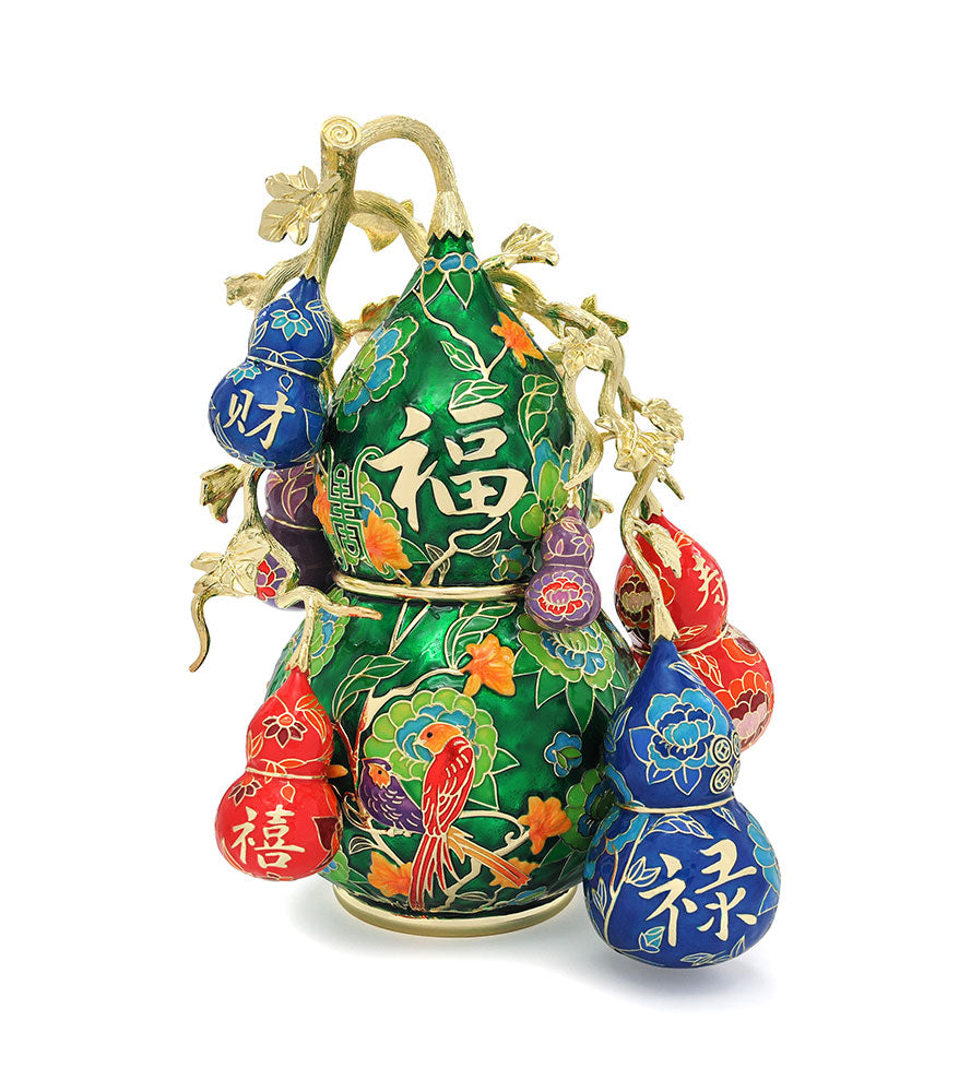 The five largest Wu Lous feature the powerful Chinese characters Fu (Blessings), Lu (Prosperity), Shou (Longevity), Xi (Joy), and Cai (Wealth). Additional smaller Wu Lous sprouting from the cluster enhance its meaning of everlasting vitality and fortune for the whole family.