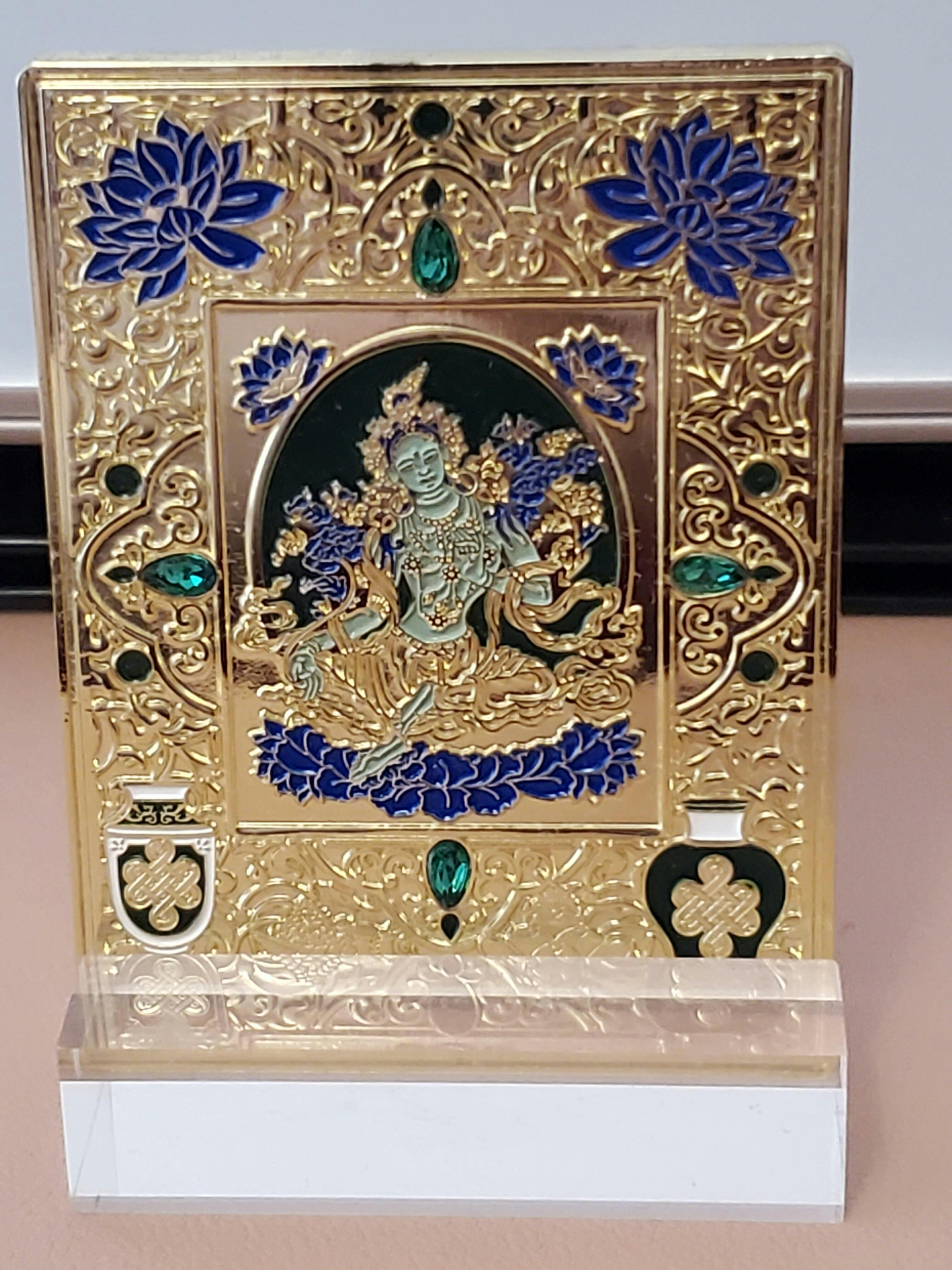 The Goddess Green Tara has the power to dissolve your troubles and make all your wishes come true. She is known as the Swift Liberator because she acts so rapidly whenever you call on her for help. Place this exquisite mini plaque with her image and mantra on your work desk to come under her protection and blessings.