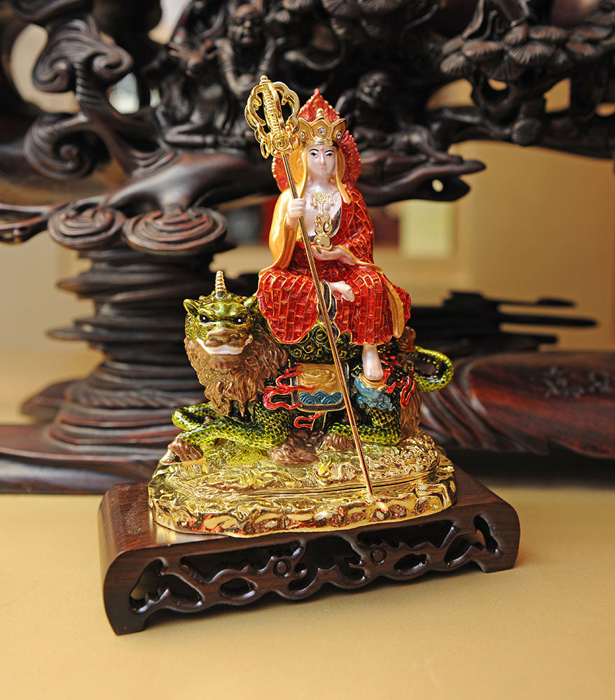 This sacred statue depicts Ksiddigarbha, the Bodhisattva of Compassion, Courage and Great Vows, seated atop a majestic Chi Lin, a mythical creature revered for its power to guard, purify and bring peace.