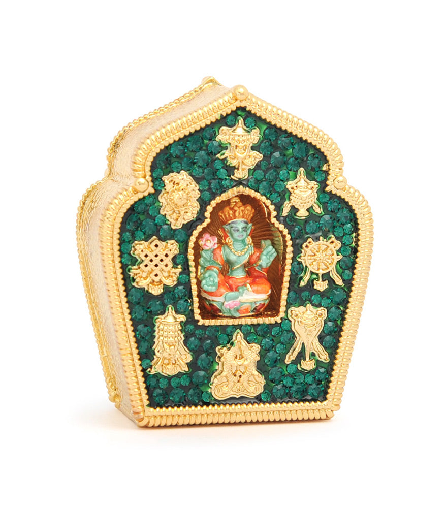 This stunning Green Tara home amulet features the 8 Auspicious Objects which helps you to overcome all manner of obstacles and problems. Green Tara is the Swift Liberator and the Mother of all Taras, and grants wishes and dissolves troubles whenever you call on her help. She also protects you from the 8 fears thieves, black magic, water, poverty, fire, injustice, bullies and poison.