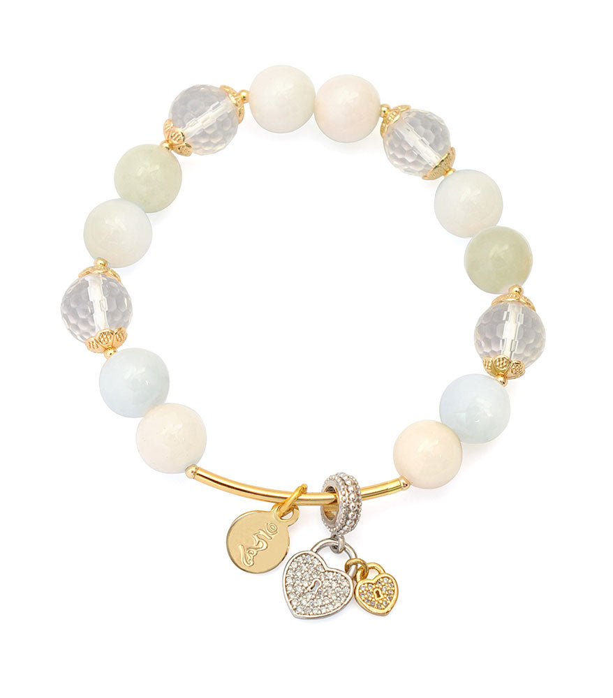 Morgan stone with their gentle pastel colours is connected to the heart chakra. When worn next to your skin, it helps activate the positive aspects of the heart, bringing joy, contentment and overall happiness into your life. This bracelet is strung with a pair heart locks, signifying continuous love between two people.