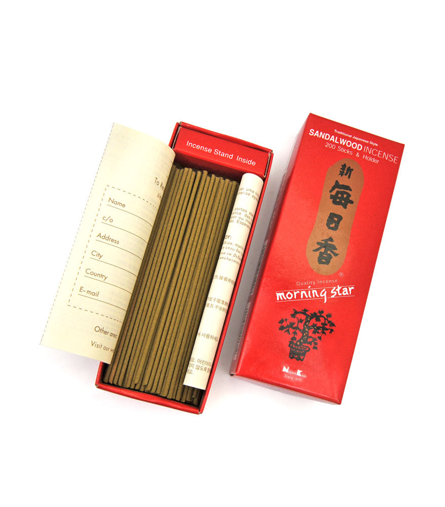 The best-selling incense for daily use. Morning Star incense was created in the 1960s in Japan. It has been loved for over 40 years not only by the Japanese but people all over the world. The powerful fragrances in this collection mixed with high quality ingredients such as pure floral essences and aromatic woods, have made this incense a beloved and trusted worldwide brand. Morning Star is perfect for when you want to create a relaxing atmosphere for meditation, prayer, and yoga. This is a value package and contains 200 sticks. Morning Star sticks have no bamboo core, which means there is no wood odor when burning, so you can enjoy the true fragrance of the incense. Traditional Japanese Style