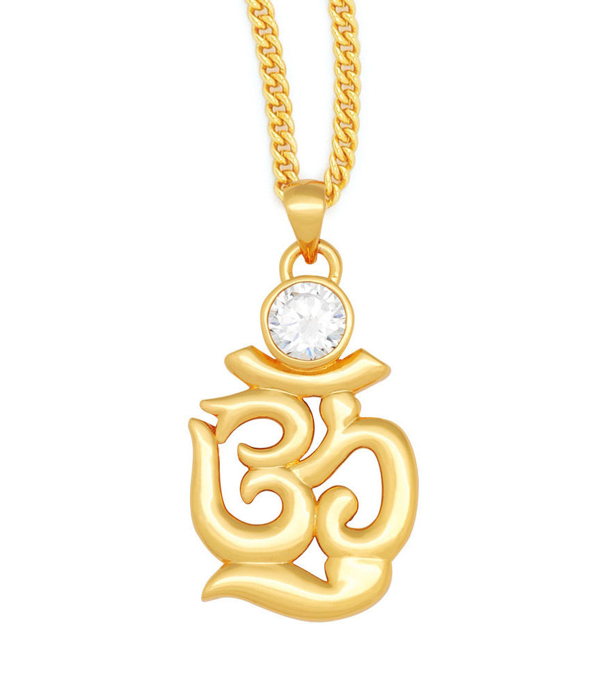This stunning necklace features the syllable OM with a large man-made diamond. It is symbol of indestructibility in all Hindu and Buddhist Traditions. Wear as a strong safeguard against evil and unnatural death, and to attract happiness into your life.
