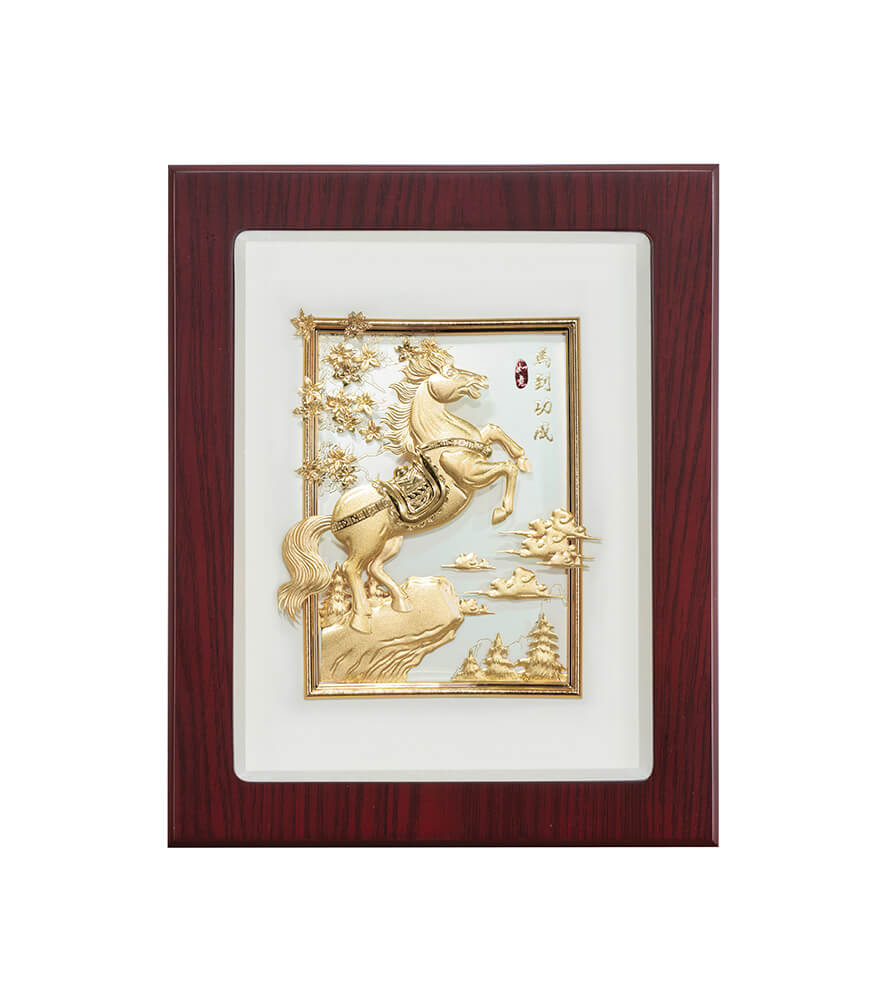 This gilded Victory Horse Plaque imbues one with the speed, strength, determination, endurance and resilience to overcome all obstacles and come out on top. Inscribed with the Chinese characters 马到成功 or "Mah Tou Koong Sing", it brings successful outcomes to everything you do, which results in the swift achievement of your goals.