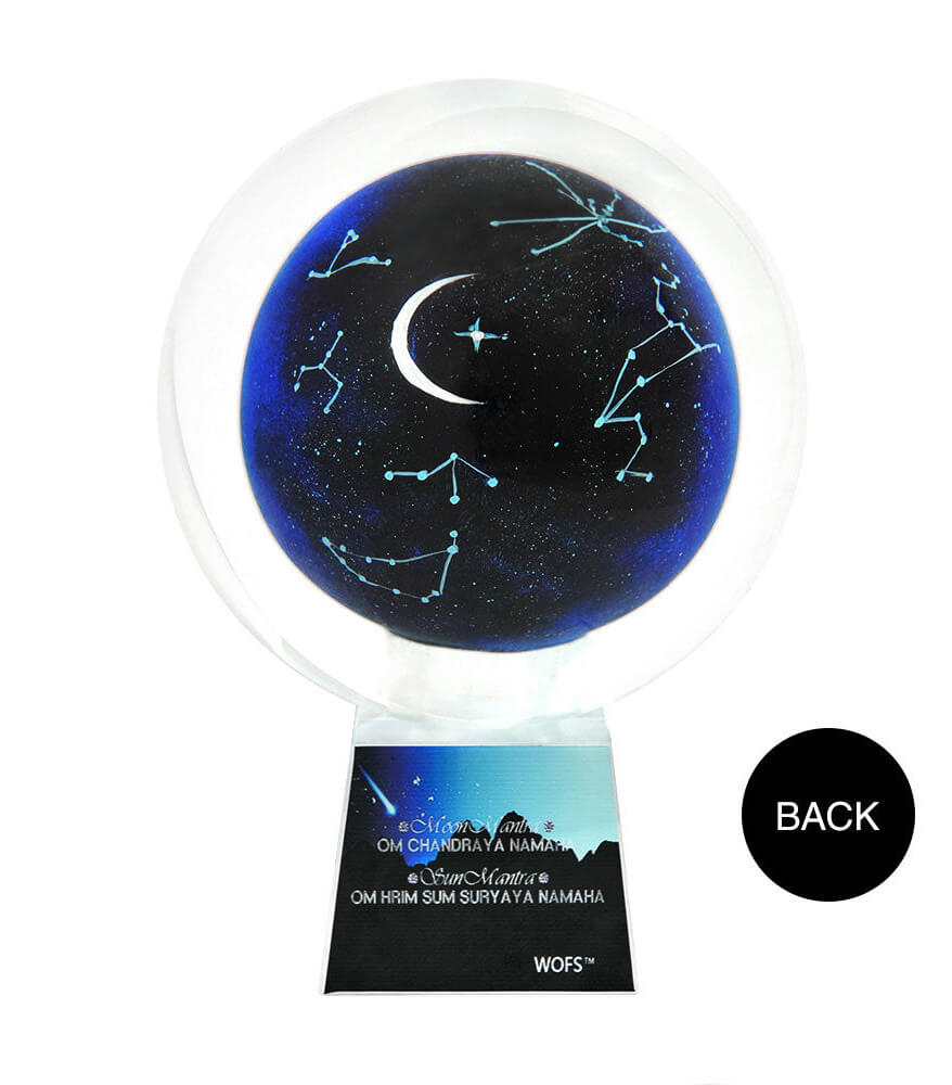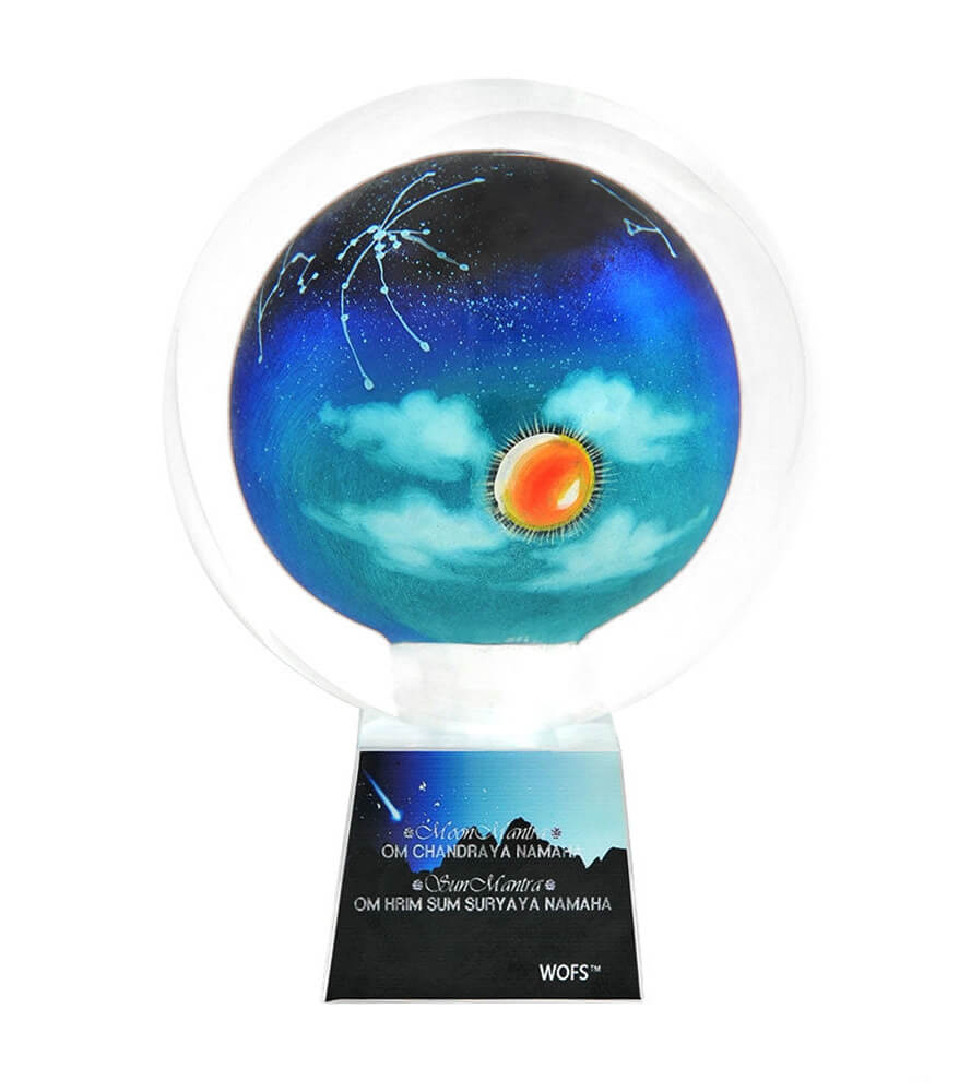 The Sun and Moon Globe is an excellent cure against natural disasters. This sacred globe made in glass signifies the power of Earth energy. The images of the Sun and Moon and invocations enlist the help of the Sun and the Moon. The currents of the Moon help stave off the impact of extreme weather that brings great natural disasters. The Sun's energy protects against big misfortune brought by extreme winds, big fires, angry waters and shifting earth.